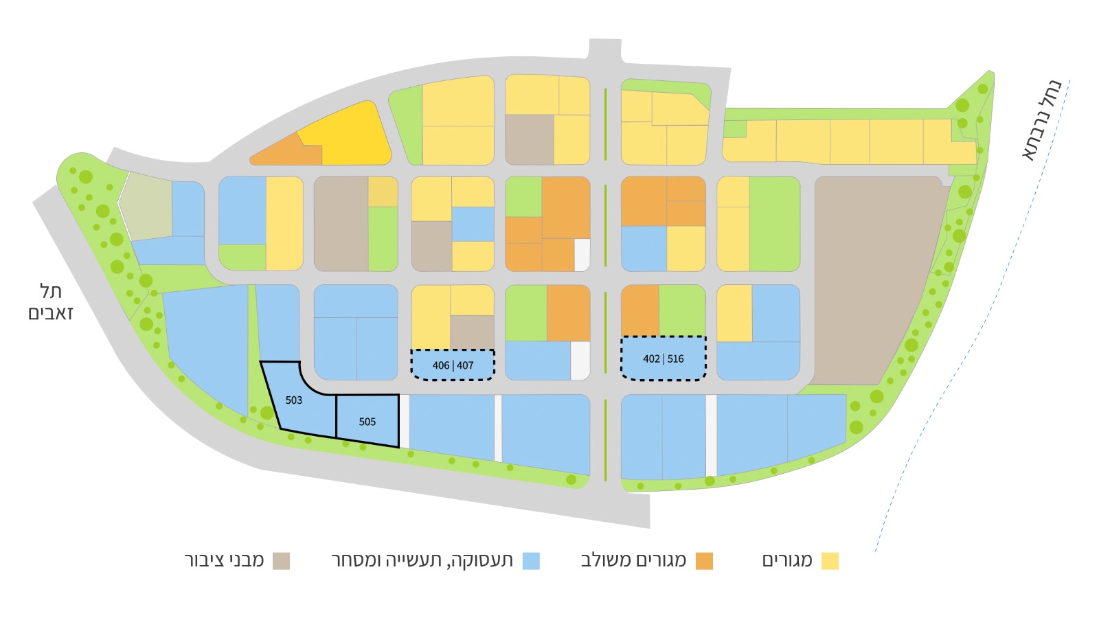 שני מתחמים נוספים שנכללו במכרז לא שווקו, לאחר שלא הוגשו עבורם הצעות. מתחם 75418 כולל את המגרשים 402 ו-516 ומתחם 75420 – כולל את המגרשים 406 ו-407. מדובר במתחמים שהוצעו ליזמים בשני סבבי שיווק קודמים ברובע חריש דרום, ולא זכו לביקוש גם אז. גם במכרז הנוכחי, חרף הייעוד למסחר ולתעסוקה, לא הוגשו עבורם הצעות.